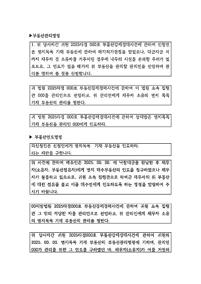 부동산관리명령, 인도명령신청 등 신청취지 기재, 단 무단전재 방지목적으로 PDF 파일로 올리니, 혹 원본 파일이 필요하신 분들은 톡이나 문자, 메일, 전화 등을 주시면 작성방법 등에 대한 간단한 무료상담과 함께 원본 파일을 보내드리도록 하겠습니다.