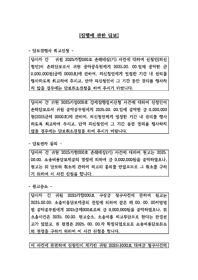 담보권행사 최고신청, 당보권자 동의, 담보물 변환, 담보제공 가압류 등 취소, 소송비용담보제공 기한연장, 가집행 담보취소, 대위담보취소, 동의에 의한 담보취소신청, 권리행사 최고 등 집행에 관한 담보 관련 신청취지 기재, 단 무단전재 방지목적으로 PDF 파일로 올리니, 혹 원본 파일이 필요하신 분들은 톡이나 문자, 메일, 전화 등을 주시면 작성방법 등에 대한 간단한 무료상담과 함께 원본 파일을 보내드리도록 하겠습니다.