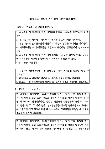유체물인도청구권 압류, 유체동산강제집행촉구, 유체동산 추심, 집행관에 대한 경매개시명령신청,집행관처분에 대한 이의신청 등 신청취지 기재, 단 무단전방지목적으로 PDF 파일로 올리니, 혹 원본 파일이 필요하신 분들은 톡이나 문자, 메일, 전화 등을 주시면 작성방법 등에 대한 간단한 무료상담과 함께 원본 파일을 보내드리도록 하겠습니다.