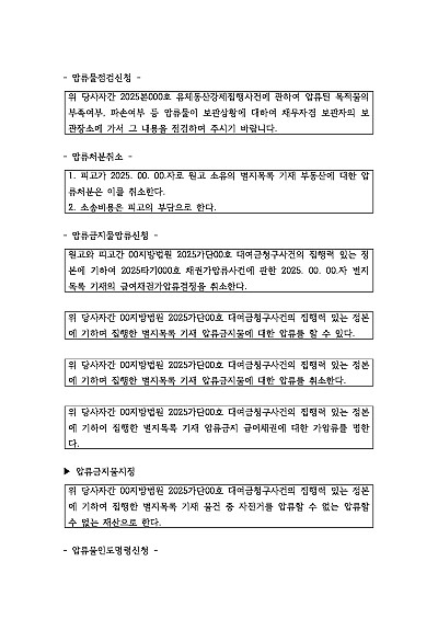 압류물점검신청, 압류처분취소, 압류금지물인도명령신청 등 사건 신청취지 기재, 단 무단전재 방지목적으로 PDF 파일로 올리니, 혹 원본 파일이 필요하신 분들은 톡이나 문자, 메일, 전화 등을 주시면 작성방법 등에 대한 간단한 무료상담과 함께 원본 파일을 보내드리도록 하겠습니다.