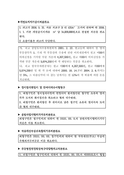 개별토지지가공시처분취소, 경지정리편입지 매수협의, 공원사업시행허가거부처분취소, 국유재산무상귀속협의거부처분취소, 무단형질변경원상복구대집행계고처분취소 등 사건 신청취지 기재, 단 무단전재 방지목적으로 PDF 파일로 올리니, 혹 원본 파일이 필요하신 분들은 톡이나 문자, 메일, 전화 등을 주시면 작성방법 등에 대한 간단한 무료상담과 함께 원본 파일을 보내드리도록 하겠습니다.