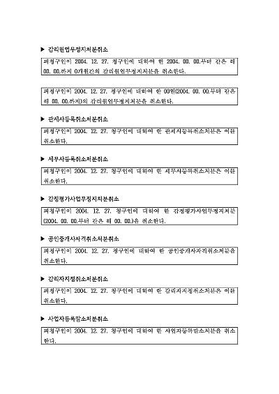 감리원업무정지처분취소, 관세사등록취소처분취소,세무사등록취소처분취소, 감정평가사업무정지처분취소, 공인중개사자격취소처분취소, 감리자지정치소처분취소, 사업자등록말소처분취소 등 사건 신청취지 기재, 단 무단전재 방지목적으로 PDF 파일로 올리니, 혹 원본 파일이 필요하신 분들은 톡이나 문자, 메일, 전화 등을 주시면 작성방법 등에 대한 간단한 무료상담과 함께 원본 파일을 보내드리도록 하겠습니다.
