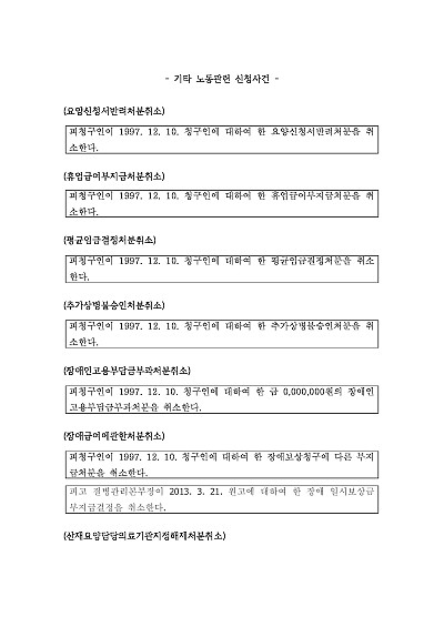 요양신청서반려처분취소, 휴업급여부지급처분취소, 평균임금결정처분취소, 추가상평불승인처분취소, 장애인고용부담금부과처분취소, 장애금여에관한처분취소, 산재요양담담의료기관지정해제처분취소, 중노위판정취소,간점보상이행청구, 중재재정처분취소, 급여지급등이행청구, 요양불승인처분취소 등 사건 신청취지 기재, 단 무단전재 방지목적으로 PDF 파일로 올리니, 혹 원본 파일이 필요하신 분들은 톡이나 문자, 메일, 전화 등을 주시면 작성방법 등에 대한 간단한 무료상담과 함께 원본 파일을 보내드리도록 하겠습니다.