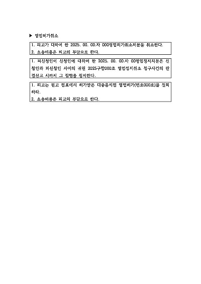 영업허가취소처분 취소, 영업허가 철회신청 등 사건 신청취지 기재, 단 무단전재 방지목적으로 PDF 파일로 올리니, 혹 원본 파일이 필요하신 분들은 톡이나 문자, 메일, 전화 등을 주시면 작성방법 등에 대한 간단한 무료상담과 함께 원본 파일을 보내드리도록 하겠습니다.
