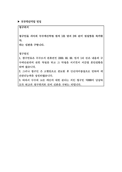 부부재산약정변경 관련 청구취지 기재, 단 무단전재 방지목적으로 PDF 파일로 올리니, 혹 원본 파일이 필요하신 분들은 톡이나 문자, 메일, 전화 등을 주시면 작성방법 등에 대한 간단한 무료상담과 함께 원본 파일을 보내드리도록 하겠습니다.
