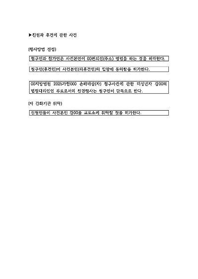 행사방법 결정, 자 감화기관 위탁 등 친권 후견에 관한 사건 관련 청구취지 기재, 단 무단전재 방지목적으로 PDF 파일로 올리니, 혹 원본 파일이 필요하신 분들은 톡이나 문자, 메일, 전화 등을 주시면 작성방법 등에 대한 간단한 무료상담과 함께 원본 파일을 보내드리도록 하겠습니다.