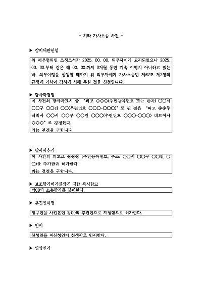 감치재판신청, 당사자표시경정, 당사자추가, 후견인지정, 인지, 입양인가, 접근금지 등 사건 청구취지 기재, 단 무단전재 방지목적으로 PDF 파일로 올리니, 혹 원본 파일이 필요하신 분들은 톡이나 문자, 메일, 전화 등을 주시면 작성방법 등에 대한 간단한 무료상담과 함께 원본 파일을 보내드리도록 하겠습니다.