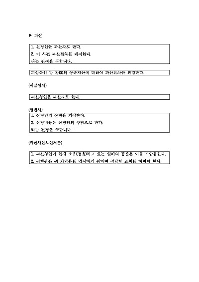 파산신청, 지급정지, 파산재산보전처분 등 신청사건 신청취지 기재, 단 무단전재 방지목적으로 PDF 파일로 올리니, 혹 원본 파일이 필요하신 분들은 톡이나 문자, 메일, 전화 등을 주시면 작성방법 등에 대한 간단한 무료상담과 함께 원본 파일을 보내드리도록 하겠습니다.