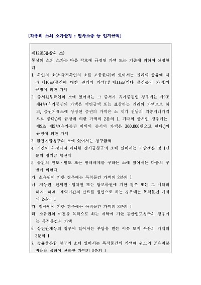 주요내용 : 통상의 소송, 등기등록 등 절차에 관한 소송, 명예회복을 위한 처분 청구의 소송, 회사 등 관계소송 등, 단체소송, 집행법상의 소송, 행정소송, 특허소송, 무체재산권에 관한 소송, 소가를 산출할 수 없는 재산권상의 소송, 시효중단을 위한 재판상 청구 확인소송 등과 관련된 구체적 소가산정의 기준을 담았다.