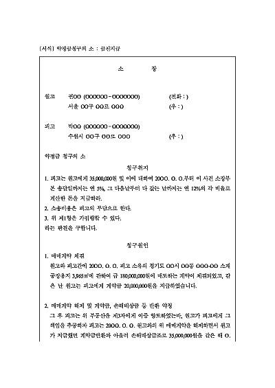 주요내용 : 매매계약해제, 계약금반환 및 손해배상금지급 약정, 약정불이행시 그 지급을 구하기 위한 목적으로 사용되어지는 소장 양식임. 단 무단전재 방지목적으로 PDF 파일로 올리니, 구매하신 후 혹 원본 파일이 필요하신 분들은 톡이나 문자, 메일, 전화 등을 주시면 작성방법 등에 대한 간단한 무료상담과 함께 원본 파일을 보내드리도록 하겠습니다.