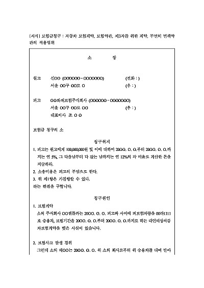 주요내용 : 자동차보험계약체결, 보험사고 발생, 약관에 의한 보험금지급청구시 사용되어지는 소장 양식임. 단 무단전재 방지목적으로 PDF 파일로 올리니, 구매하신 후 혹 원본 파일이 필요하신 분들은 톡이나 문자, 메일, 전화 등을 주시면 작성방법 등에 대한 간단한 무료상담과 함께 원본 파일을 보내드리도록 하겠습니다.