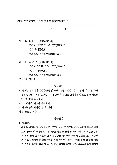 주요내용 : 공동불법행위자 1인 전액변제 후 나머자 공동불법행위자 상대 구상금청구시 사용되어지는 소장 양식임. 단 무단전재 방지목적으로 PDF 파일로 올리니, 구매하신 후 혹 원본 파일이 필요하신 분들은 톡이나 문자, 메일, 전화 등을 주시면 작성방법 등에 대한 간단한 무료상담과 함께 원본 파일을 보내드리도록 하겠습니다.