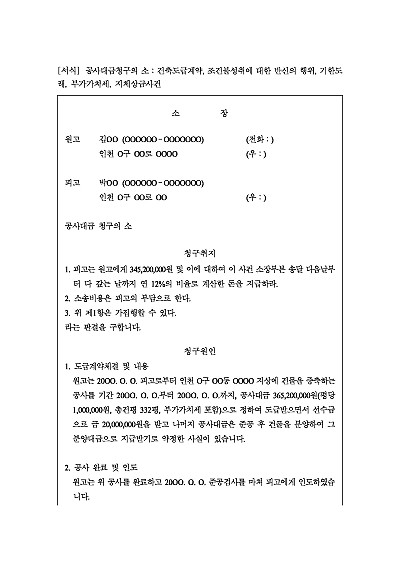 주요내용 : 건축도급계약체결, 일의 완성 후 인도, 잔대금지급 거절시 그 청구를 위하여 사용되어지는 소장 양식임. 단 무단전재 방지목적으로 PDF 파일로 올리니, 구매하신 후 혹 원본 파일이 필요하신 분들은 톡이나 문자, 메일, 전화 등을 주시면 작성방법 등에 대한 간단한 무료상담과 함께 원본 파일을 보내드리도록 하겠습니다.