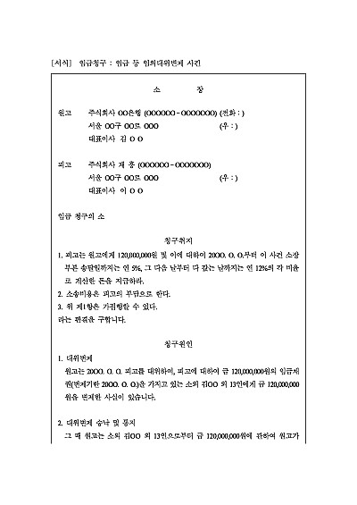 주요내용 : 원고의 소외인들에 대한 임금 임의대위변제 후 피고를 상대로 당해 변제금을 청구할 목적으로 사용되어지는 양식임. 단 무단전재 방지목적으로 PDF 파일로 올리니구매하신 후 혹 원본 파일이 필요하신 분들은 톡이나 문자메일전화 등을 주시면 작성방법 등에 대한 간단한 무료상담과 함께 원본 파일을 보내드리도록 하겠습니다.
