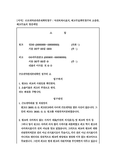 주요내용 : 비진의 의사표시에 의한 사직서 제출, 상대방 인식, 의사표시 무효를 근거로 근로자계약관계존재확인을 구할 목적으로 사용되어지는 소장 양식임. 단 무단전재 방지목적으로 PDF 파일로 올리니, 구매하신 후 혹 원본 파일이 필요하신 분들은 톡이나 문자, 메일, 전화 등을 주시면 작성방법 등에 대한 간단한 무료상담과 함께 원본 파일을 보내드리도록 하겠습니다.