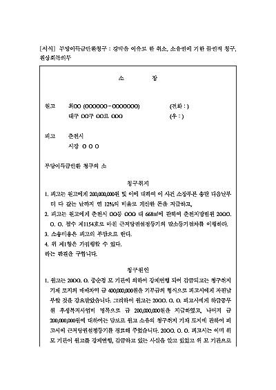 주요내용 : 강박에 의한 기부 및 그에 대한 담보조로 근저당권설정, 강박을 이유로한 의사표시 취소 후 원상회복을 구하기 위한 목적으로 사용되어지는 양식임. 단 무단전재 방지목적으로 PDF 파일로 올리니, 구매하신 후 혹 원본 파일이 필요하신 분들은 톡이나 문자, 메일, 전화 등을 주시면 작성방법 등에 대한 간단한 무료상담과 함께 원본 파일을 보내드리도록 하겠습니다.