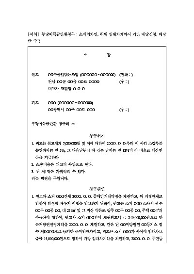 주요내용 : 허위 임대차계약서를 기반으로 소액임차인이 배당절차에서 불법하게 배당금수령, 당해 배당금 상당의 부당이득의 반환을 청구하기 위하여 제기하는 소송형태임. 단 무단전재 방지목적으로 PDF 파일로 올리니, 구매하신 후 혹 원본 파일이 필요하신 분들은 톡이나 문자, 메일, 전화 등을 주시면 작성방법 등에 대한 간단한 무료상담과 함께 원본 파일을 보내드리도록 하겠습니다.