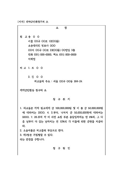 주요내용 : 계약이 상대방의 귀책사유로 해제, 무효, 취소되었을 때 기 지급한 계약금을 반환받기 위한 목적으로 사용되어지는 소장 양식임. 단 무단전재 방지목적으로 PDF 파일로 올리니, 구매하신 후 혹 원본 파일이 필요하신 분들은 톡이나 문자, 메일, 전화 등을 주시면 작성방법 등에 대한 간단한 무료상담과 함께 원본 파일을 보내드리도록 하겠습니다.