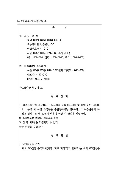 주요내용 : 원사업자로부터 받아야 할 하도급대금을 법적 절차를 통해 강제적으로 회수할 목적으로 사용되어지는 소장 양식임. 단 무단전재 방지목적으로 PDF 파일로 올리니, 구매하신 후 혹 원본 파일이 필요하신 분들은 톡이나 문자, 메일, 전화 등을 주시면 작성방법 등에 대한 간단한 무료상담과 함께 원본 파일을 보내드리도록 하겠습니다.