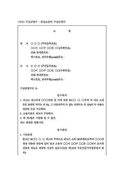 주요내용 : 대출시 물상보증, 채무자 미변제, 물상보증인 변제후 주채무자 상대 구상금청구시 사용되어지는 소장 양식임. 단 무단전재 방지목적으로 PDF 파일로 올리니, 구매하신 후 혹 원본 파일이 필요하신 분들은 톡이나 문자, 메일, 전화 등을 주시면 작성방법 등에 대한 간단한 무료상담과 함께 원본 파일을 보내드리도록 하겠습니다.
