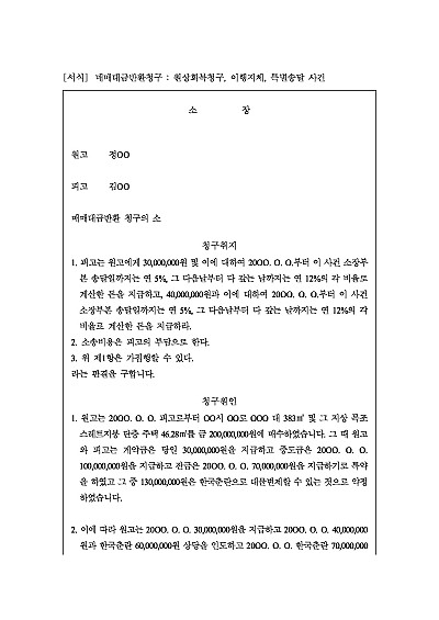 주요내용 : 부동산매매계약, 부동산이전등기절차 지체, 이행지체를 원인으로 계약해제 후 원상회복청구 등 사건관련 양식임. 단 무단전재 방지목적으로 PDF 파일로 올리니, 구매하신 후 혹 원본 파일이 필요하신 분들은 톡이나 문자, 메일, 전화 등을 주시면 작성방법 등에 대한 간단한 무료상담과 함께 원본 파일을 보내드리도록 하겠습니다.