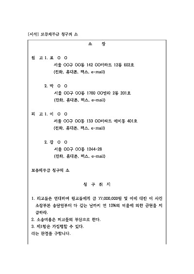주요내용 : 주채무자가 채무를 변제하지 못할 경우 보증인이 대신 변제하도록 보증채무 이행을 강제할 목적으로 사용되어지는 소장 양식임. 단 무단전재 방지목적으로 PDF 파일로 올리니구매하신 후 혹 원본 파일이 필요하신 분들은 톡이나 문자메일전화 등을 주시면 작성방법 등에 대한 간단한 무료상담과 함께 원본 파일을 보내드리도록 하겠습니다.