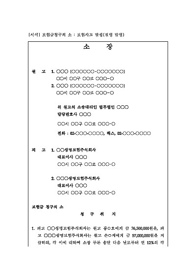 주요내용 : 보험사고 발생 후 보험가입자(보험계약자, 피보험자, 보험수익자)가 보험사를 상대로 약정된 보험금 지급을 청구했음에도, 보험사가 지급을 거절하거나 일부만 지급하는 경우 법원에 소송을 제기하여 법적 판단을 받기 위한 목적으로 사용되어지는 소장 양식임. 단 무단전재 방지 목적으로 PDF 파일로 올리니, 구매하신 후 혹 원본 파일이 필요하신 분들은 톡이나 문자, 메일, 전화 등을 주시면 작성 방법 등에 대한 간단한 무료 상담과 함께 원본 파일을 보내드리도록 하겠습니다.