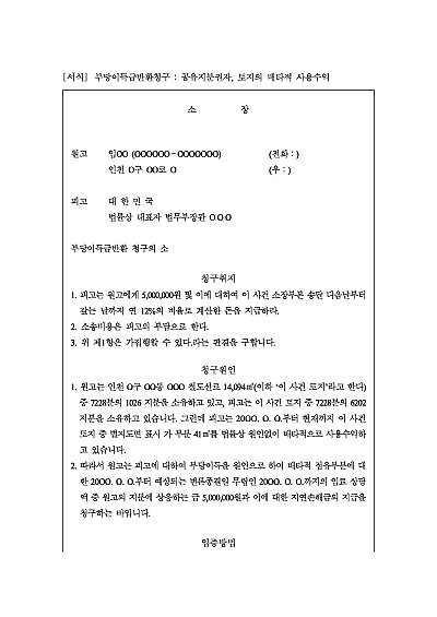 주요내용 : 공유토지, 지분권자 1인의 배타적 사용수익, 독점적 사용수익에 대한 임대료 상당의 부당이득금청구시 사용되어지는 양식임. 단 무단전재 방지목적으로 PDF 파일로 올리니구매하신 후 혹 원본 파일이 필요하신 분들은 톡이나 문자메일전화 등을 주시면 작성방법 등에 대한 간단한 무료상담과 함께 원본 파일을 보내드리도록 하겠습니다.