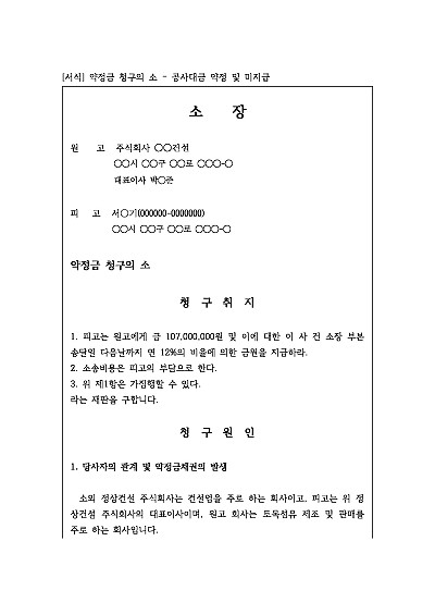 약정금 청구의 소 – 공사대금 약정 및 미지급 요약정보 및 구매