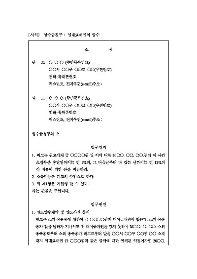 주요내용 : 대여금채무에 대한 변제로 임대차보증금 양도 및 임대인에 대한 양도통지, 양수인 양수금지급요청 및 거절시 그 지급을 구하기 위한 목적으로 사용되어지는 소송형태임. 단 무단전재 방지목적으로 PDF 파일로 올리니, 구매하신 후 혹 원본 파일이 필요하신 분들은 톡이나 문자, 메일, 전화 등을 주시면 작성방법 등에 대한 간단한 무료상담과 함께 원본 파일을 보내드리도록 하겠습니다.