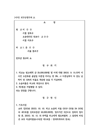민사소송에서는 원고가 소송에 청구하는 내용(청구취지)에 따라 대여금청구의 소, 양수금청구의 소, 매매대금청구의 소, 임대차보증금청구의 소 등 무수히 많은 유형으로 분류된다.