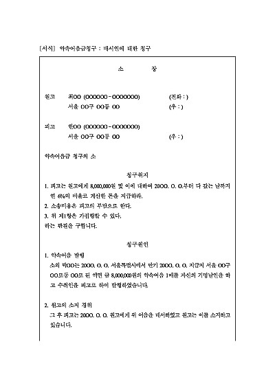 민사소송에서는 원고가 소송에 청구하는 내용(청구취지)에 따라 대여금청구의 소, 양수금청구의 소, 매매대금청구의 소, 임대차보증금청구의 소 등 무수히 많은 유형으로 분류된다.
