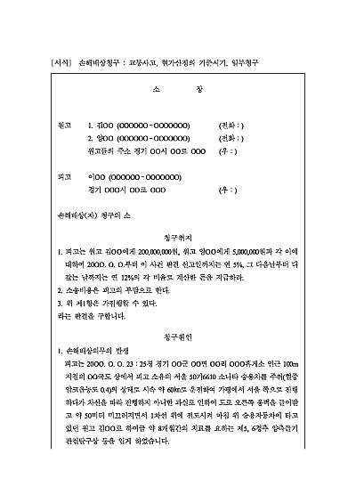 주요내용 : 교통사고로 인한 상해발생, 일실수익, 기왕치료비, 향후치료비, 위자료 등 손해배상의 범위 특정, 신체감정 후 확장청구를 위한 일부청구 소장 양식임. 단 무단전재 방지목적으로 PDF 파일로 올리니, 구매하신 후 혹 원본 파일이 필요하신 분들은 톡이나 문자, 메일, 전화 등을 주시면 작성방법 등에 대한 간단한 무료상담과 함께 원본 파일을 보내드리도록 하겠습니다.