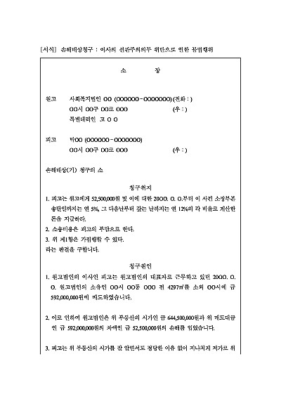 주요내용 : 이사의 선관주의 의무 위반으로 인한 손해발생, 당해 손해의 배상을 청구하기 위한 목적으로 사용되어지는 양식임. 단 무단전재 방지목적으로 PDF 파일로 올리니구매하신 후 혹 원본 파일이 필요하신 분들은 톡이나 문자메일전화 등을 주시면 작성방법 등에 대한 간단한 무료상담과 함께 원본 파일을 보내드리도록 하겠습니다.