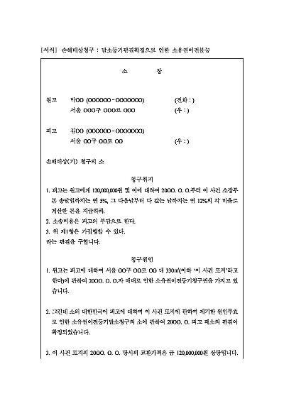 주요내용 : 제3자가 매도인인 피고를 상대로 원인무효를 원인으로 한 소유권이전등기말소소송 제기 후 승소, 이행불능으로 인한 손해발생, 당해 손해배상의 청구를 목적으로 사용되어지는 양식임. 단 무단전재 방지목적으로 PDF 파일로 올리니, 구매하신 후 혹 원본 파일이 필요하신 분들은 톡이나 문자, 메일, 전화 등을 주시면 작성방법 등에 대한 간단한 무료상담과 함께 원본 파일을 보내드리도록 하겠습니다.