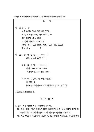 주요내용 :명의신탁 약정의 무효를 주장하며 명의수탁자에게 신탁 해지를 원인으로 원래의 소유권이전등기 절차를 이행하도록 청구함을 목적으로 사용되는 소장 양식임. 단 무단전재 방지목적으로 PDF 파일로 올리니, 구매하신 후 혹 원본 파일이 필요하신 분들은 톡이나 문자, 메일, 전화 등을 주시면 작성방법 등에 대한 간단한 무료상담과 함께 원본 파일을 보내드리도록 하겠습니다.