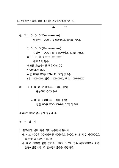 주요내용 : 등기부상의 소유권이전등기가 실제 법률관계와 맞지 않으므로, 이를 말소하여 부동산의 실질적인 소유권자와 등기부상 소유자를 일치시키는 것이 목적으로 사용되어지는 소장 양식임. 단 무단전재 방지목적으로 PDF 파일로 올리니, 구매하신 후 혹 원본 파일이 필요하신 분들은 톡이나 문자, 메일, 전화 등을 주시면 작성방법 등에 대한 간단한 무료상담과 함께 원본 파일을 보내드리도록 하겠습니다.
