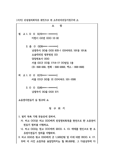 주요내용 : 진정한 소유자가 다른 사람의 이름으로 되어 있는 등기를 말소하고 자신의 명의로 되찾기 위한 목적으로 상용되어지는 신청서 양식임. 단 무단전재 방지목적으로 PDF 파일로 올리니, 구매하신 후 혹 원본 파일이 필요하신 분들은 톡이나 문자, 메일, 전화 등을 주시면 작성방법 등에 대한 간단한 무료상담과 함께 원본 파일을 보내드리도록 하겠습니다.