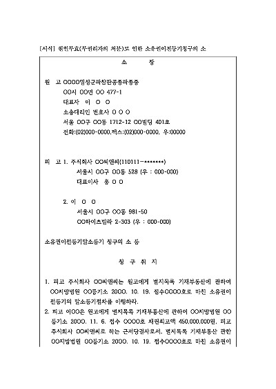 원인무효의 소유권이전등기를 말소하여 진정한 소유자의 등기명의를 회복하는 것을 목적이며, 이는 소유권에 기한 방해배제청구권에 해당하며, 등기부상의 권리관계와 실제 권리관계를 일치시키는 데 그 목적으로 사용되어지는 소장 양식임. 단 무단전재 방지목적으로 PDF 파일로 올리니구매하신 후 혹 원본 파일이 필요하신 분들은 톡이나 문자메일전화 등을 주시면 작성방법 등에 대한 간단한 무료상담과 함께 원본 파일을 보내드리도록 하겠습니다.