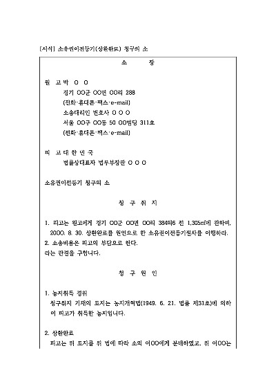 주요내용 : 농지 등 부동산의 매수인이 매도인의 상환완료 후 등기의무를 이행하지 않을 때, 매수인이 법원에 소송을 제기하여 법원의 판결을 통해 소유권이전등기를 강제로 이행하게 만들 목적으로 사용되어지는 소장 양식임. 단 무단전재 방지목적으로 PDF 파일로 올리니, 구매하신 후 혹 원본 파일이 필요하신 분들은 톡이나 문자, 메일, 전화 등을 주시면 작성방법 등에 대한 간단한 무료상담과 함께 원본 파일을 보내드리도록 하겠습니다.