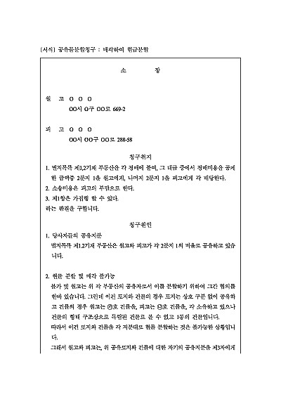 주요내용 : 공유지분, 분할협의 및 매각 불가능, 경매에 의한 현금분할 청구시 사용되어지는 소장 양식임. 단 무단전재 방지목적으로 PDF 파일로 올리니구매하신 후 혹 원본 파일이 필요하신 분들은 톡이나 문자메일전화 등을 주시면 작성방법 등에 대한 간단한 무료상담과 함께 원본 파일을 보내드리도록 하겠습니다.