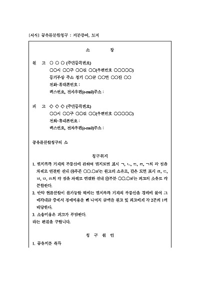 주요내용 : 공유지분, 현물분할 반대, 현물분할을 청구하면서, 만일 현물분할이 어려울 경우 경매 후 현금분분할 청구시 사용되어지는 소장 양식임. 단 무단전재 방지목적으로 PDF 파일로 올리니, 구매하신 후 혹 원본 파일이 필요하신 분들은 톡이나 문자, 메일, 전화 등을 주시면 작성방법 등에 대한 간단한 무료상담과 함께 원본 파일을 보내드리도록 하겠습니다.