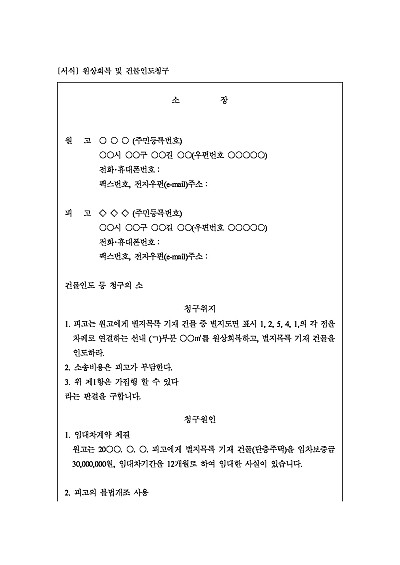 주요내용 : 임대차계약 체결 후 임차인의 불법개조 사용 이를 이유로 원상회복 및 건물인도를 구하기 위한 목적으로 사용되어지는 소장 양식임. 단 무단전재 방지목적으로 PDF 파일로 올리니구매하신 후 혹 원본 파일이 필요하신 분들은 톡이나 문자메일전화 등을 주시면 작성방법 등에 대한 간단한 무료상담과 함께 원본 파일을 보내드리도록 하겠습니다.