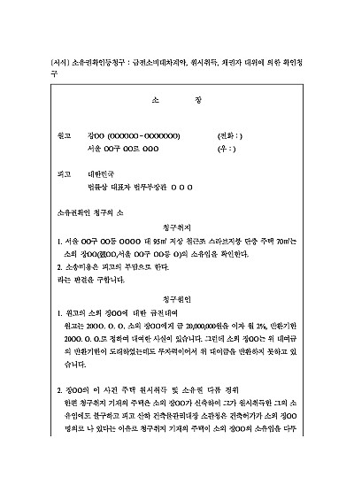 주요내용 : 금전대여, 채무자 유일재산 소유권다툼, 채권자 대위에 의한 확인청구시 사용되어지는 소장 양식임. 단 무단전재 방지목적으로 PDF 파일로 올리니, 구매하신 후 혹 원본 파일이 필요하신 분들은 톡이나 문자, 메일, 전화 등을 주시면 작성방법 등에 대한 간단한 무료상담과 함께 원본 파일을 보내드리도록 하겠습니다.