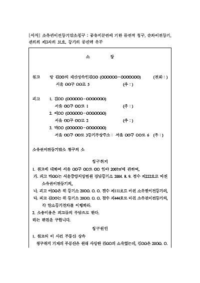 주요내용 : 부동산 상속, 피상속인의 매각사실 부존재, 피고들의 권원없는 등기경료, 당해 등기의 무효를 원인으로 말소를 구하기 위한 목적으로 사용되어지는 소장 양식임. 단 무단전재 방지목적으로 PDF 파일로 올리니, 구매하신 후 혹 원본 파일이 필요하신 분들은 톡이나 문자, 메일, 전화 등을 주시면 작성방법 등에 대한 간단한 무료상담과 함께 원본 파일을 보내드리도록 하겠습니다.