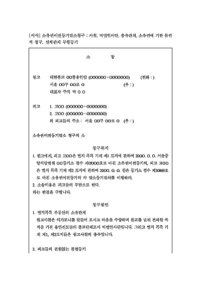 주요내용 : 종단 소유의 토지를 상대방이 매매사실 존재하지 아니함에도 권원없이 불법 등기, 무효를 원인으로 당해 등기의 말소를 구하기 위한 목적으로 사용되어지는 소장 양식임. 단 무단전재 방지목적으로 PDF 파일로 올리니, 구매하신 후 혹 원본 파일이 필요하신 분들은 톡이나 문자, 메일, 전화 등을 주시면 작성방법 등에 대한 간단한 무료상담과 함께 원본 파일을 보내드리도록 하겠습니다.