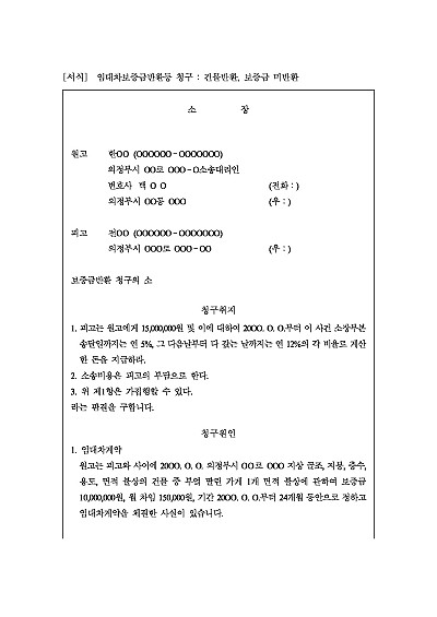 주요내용 : 임대차기간 만료, 건물명도, 보증금 미반환시 그 청구를 위하여 사용되어지는 소장 양식임. 단 무단전재 방지목적으로 PDF 파일로 올리니, 구매하신 후 혹 원본 파일이 필요하신 분들은 톡이나 문자, 메일, 전화 등을 주시면 작성방법 등에 대한 간단한 무료상담과 함께 원본 파일을 보내드리도록 하겠습니다.