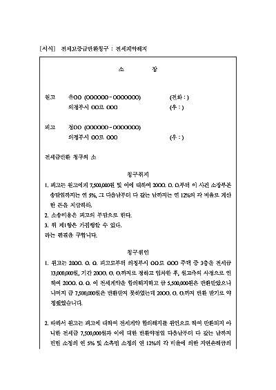 주요내용 : 전세계약 체결 후 중도 합의해지, 건물명도, 보증금 일부미반환시 당해 보증금의 반환을 받기 위한 소송에서 사용되어지는 양식임. 단 무단전재 방지목적으로 PDF 파일로 올리니, 구매하신 후 혹 원본 파일이 필요하신 분들은 톡이나 문자, 메일, 전화 등을 주시면 작성방법 등에 대한 간단한 무료상담과 함께 원본 파일을 보내드리도록 하겠습니다.