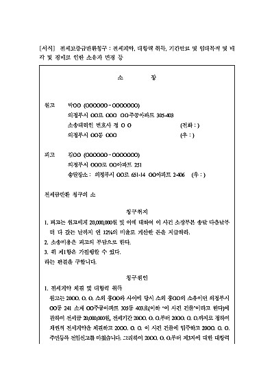 주요내용 : 계약체결 후 전입신고 등을 통한 대항력 취득, 기간만료, 목적물 양도 및 경매 등으로 소유자 변경, 당해 소유자를 상대로 한 보증금 반환청구시 사용되어지는 양식임. 단 무단전재 방지목적으로 PDF 파일로 올리니, 구매하신 후 혹 원본 파일이 필요하신 분들은 톡이나 문자, 메일, 전화 등을 주시면 작성방법 등에 대한 간단한 무료상담과 함께 원본 파일을 보내드리도록 하겠습니다.