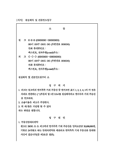 주요내용 : 임대차계약, 목적물 불법개조사용, 기간만료, 계약해지에 따른 원상회복 및 건물인도 청구시 사용되어지는 양식임. 단 무단전재 방지목적으로 PDF 파일로 올리니, 구매하신 후 혹 원본 파일이 필요하신 분들은 톡이나 문자, 메일, 전화 등을 주시면 작성방법 등에 대한 간단한 무료상담과 함께 원본 파일을 보내드리도록 하겠습니다.
